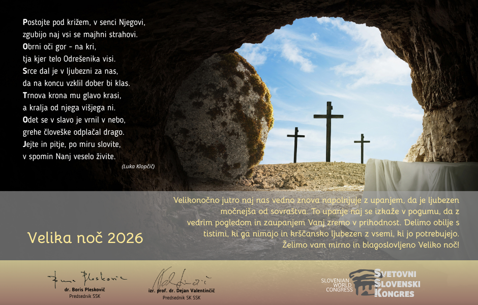 Aktualno Domov / Aktualno / Velikonočno voščilo Svetovnega slovenskega kongresa 2026 Velikonočno voščilo Svetovnega slovenskega kongresa 2026 Voščila Objavljeno: 02. 04. 2026 Deli z drugimi Tweet Pošlji na e-mail